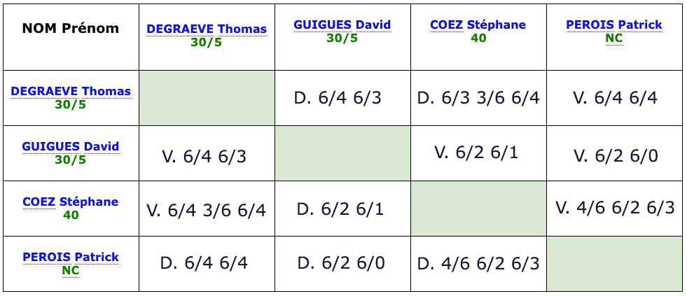 Les résultats seront mis en ligne, V pour une victoire et D pour une défaite correspondant à la personne de la ligne (pas la colonne). Il y aura 1 sortant par poule, en cas de nombre de matchs gagnés identiques pour plusieurs joueurs , il sera compté le nombre de sets puis le nombre de jeux gagnés.